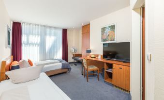 Von außen ein "Kasten" und innen echte Kölner Heizwärme. Sehr freundliches Personal und ein wirklich außergewöhnliches Frühstück. Wer möchte bekommt hier auch frisches Rührei mit Tomate, Schinken und/oder Zwiebel. Die Zimmer sind sehr geräumig und die Einrichtung in der Lobby kunstvoll und gemütlich gestaltet. ÖPNV ist in ca 500 m (Bus) bzw. 1,2 km (Stadtbahn) gut erreichbar.