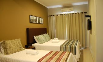 Quarto de bom tamanho, com ar condicionado e frigobar. Na recepção havia lanches, bebidas, picolés e açaí à venda. Funcionários muito educados e prestativos. O recepcionista disse que poderíamos pedir janta por aplicativo e usar o salão do hotel ou comer no quarto. Quando nosso lanche chegou, a recepcionista emprestou pratos e talheres para comermos no quarto. Estacionamento gratuito ao lado do hotel. Localização muito boa, em rua tranquila próxima a um shopping.
