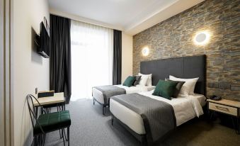 Останавливались на одну ночь. Отель чистый, персонал очень доброжелательный и приветливый, при заезде угостили вином, на следующий день разрешили оставить багаж, когда мы уже выехали из номера и поехали погулять до самолета. Завтрак стандартный-хлеб, сыр, мясная нарезка, блины и ещё какая-то выпечка. Есть кофемашина и столики на улице с пепельницами. Единственный минус, что довольно далеко от центра, мы поехали на такси, так как прохожие сказали, что идти долго, лучше такси или метро.