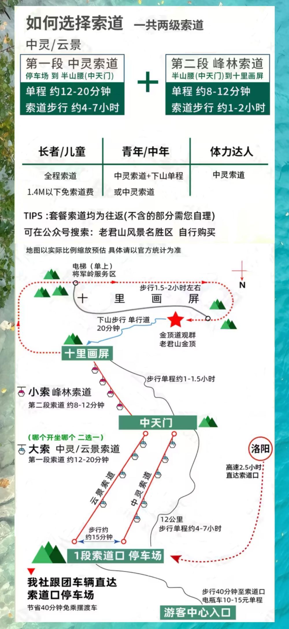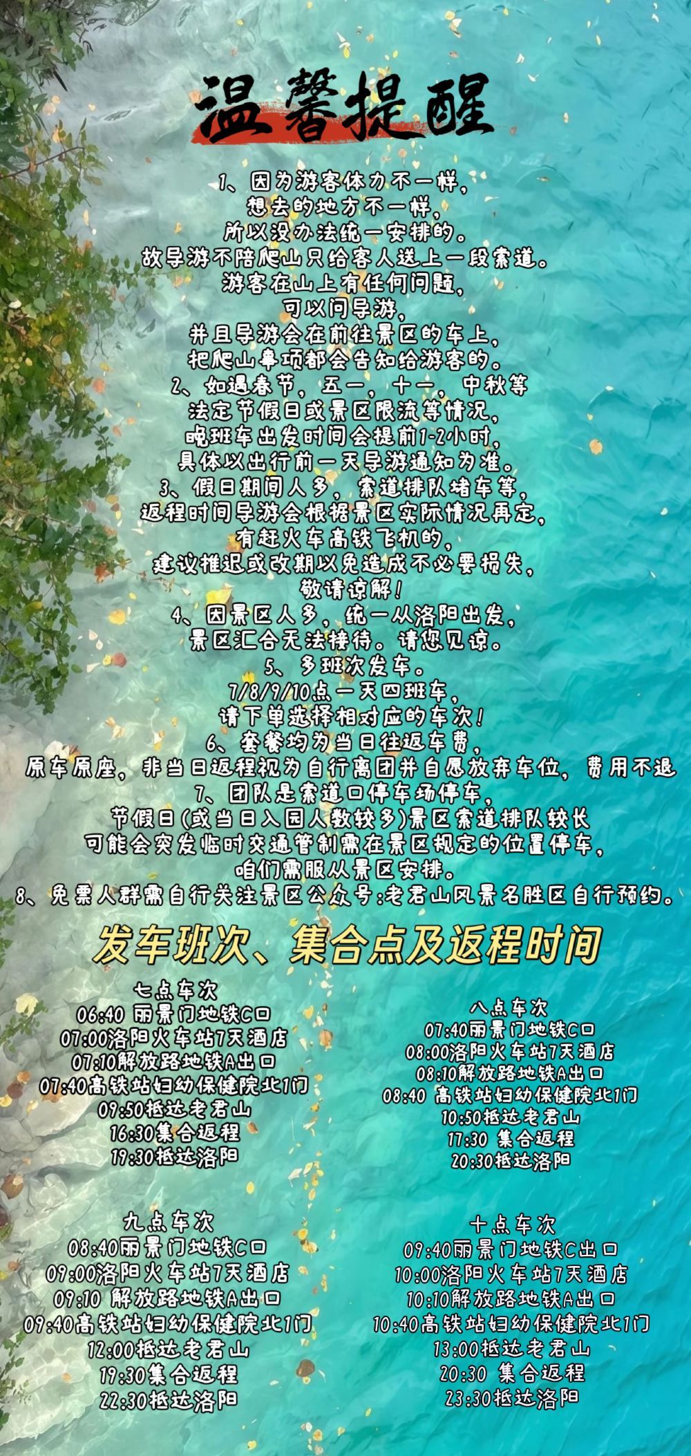 ▲ 4. Aufgrund der großen Besucherzahl in der Touristenattraktion ist ein gemeinsamer Treffpunkt in Luoyang nicht möglich. Wir bitten um Ihr Verständnis. 5. Es gibt mehrere Fahrpläne: Abfahrten um 7, 8, 9 und 10 Uhr (vier Fahrten pro Tag). Bitte wählen Sie bei der Buchung den entsprechenden Fahrplan aus. 6. Alle Pakete beinhalten die Hin- und Rückfahrt am selben Tag. Der gleiche Sitzplatz wird für die Rückfahrt reserviert. Falls Sie nicht am selben Tag zurückkehren, gilt dies als freiwilliger Austritt aus der Gruppe, und die Kosten werden nicht erstattet. 7. Die Gruppe kehrt mit der Seilbahn zum Parkplatz zurück. An Feiertagen (oder bei hohem Besucheraufkommen) kann es zu längeren Wartezeiten an der Seilbahn oder plötzlichen Verkehrsbeschränkungen kommen. In diesem Fall müssen wir auf den von der Touristenattraktion vorgegebenen Parkplätzen parken und deren Anweisungen folgen. Kostenfreie Eintrittsberechtigte müssen sich selbst über die offizielle WeChat-Seite "Laojunshan Scenic Area" informieren und eine Reservierung vornehmen.