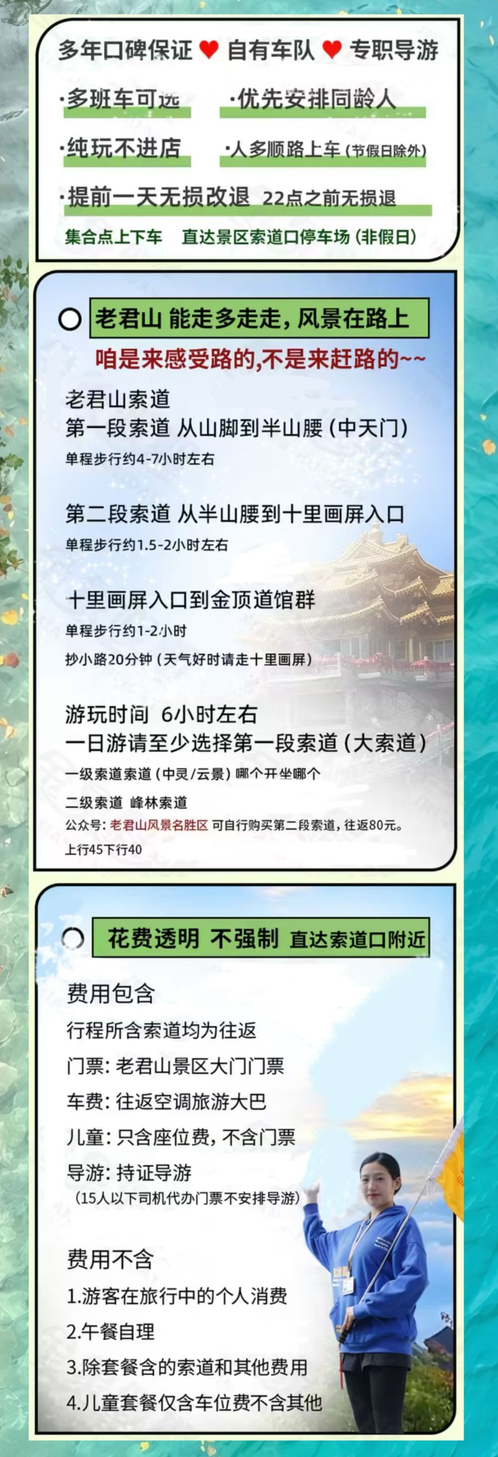 ▲ Freundliche Erinnerung: 1. Da die körperliche Verfassung der Touristen unterschiedlich ist und sie verschiedene Orte besuchen möchten, ist eine einheitliche Planung nicht möglich. Daher begleitet der Reiseleiter die Touristen nicht beim Bergsteigen, sondern bringt sie nur zu einem bestimmten Abschnitt des Weges. Bei Fragen auf dem Berg können sich die Touristen an den Reiseleiter wenden. Zudem wird der Reiseleiter den Touristen im Bus auf dem Weg zur Touristenattraktion alle wichtigen Informationen zum Bergsteigen mitteilen. 2. Falls der Besuch auf gesetzliche Feiertage wie Frühlingsfest, 1. Mai, Nationalfeiertag oder Mondfest fällt oder die Touristenattraktion Besucherbeschränkungen hat, kann die Abfahrtszeit des Abendbusses 1-2 Stunden früher liegen. Die genaue Zeit wird der Reiseleiter am Tag vor der Abreise bekannt geben. 3. Während der Feiertage ist viel los. Wartezeiten an der Seilbahn und Staus können die Rückkehrzeit beeinflussen. Der Reiseleiter wird die Rückkehrzeit je nach Situation in der Touristenattraktion festlegen. Touristen, die Züge, Hochgeschwindigkeitszüge oder Flugzeuge erreichen müssen, sollten ihre Reise verschieben oder umbuchen, um unnötige Verluste zu vermeiden. Vielen Dank für Ihr Verständnis!