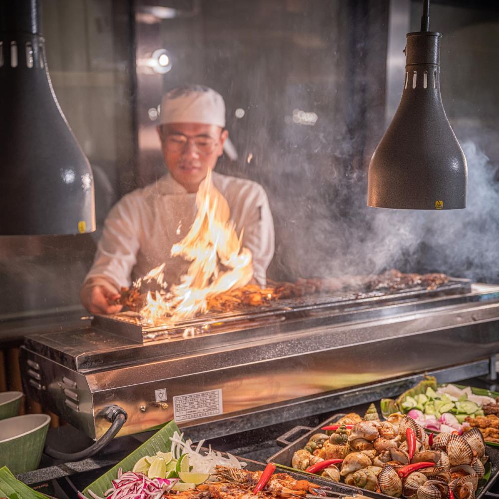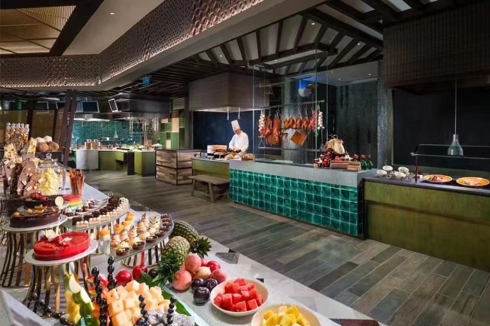 Mittagsbuffet von Montag bis Freitag: frischer Saft, Milchtee nach Hongkong-Art, Kaffee und Eistee mit Zitrone